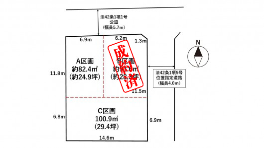 - 北側公道(幅員約5.7m)に約6.9m接道